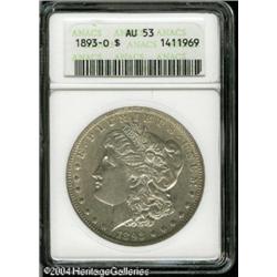 1893-O S$1 AU53 ANACS. A sharp and attractive piec <B>1893-O S$1 AU53 ANACS.</B></I> A sharp and attractive piece without relevant handling marks. Luster fills the peripheries and the recesses of the devices. A much better date, as are all Morgan Dollars from 1893 to 1895. <BR><BR><B>Important notice:</B> Heritage usually auctions material at the rate of 200-250 lots per hour. On some occasions eBay Live bid software or the Internet may not be able to keep up with the pace of the auction. We recommend placing a realistic absentee bid now as insurance to avoid disappointment. Occasionally the auctioneer may eliminate or reject an eBay Live bid, and the auctioneer may also reopen a lot after the close of the eBay live bidding (usually because we missed an audience bid), and may reject your bid even if it shows you as the winning bidder. By bidding via eBay Live, you agree that Heritage may award the lot to another bidder at its sole discretion under the circumstances described above or any other reasonable circumstances. Since eBay bids are not shown to us until we open the lot on the floor, we treat those bids just like floor bids. In most cases the floor responds before the eBay bid is presented to us, due to Internet lag time, so for consistency we have made it a policy that floor bids are always considered first over tie eBay live bids. Also please note that all Heritage lots purchased through eBay Live carry a 20% Buyer's Premium. Please make sure you read the Terms and Conditions before you bid. This lot is being auctioned in conjunction with a live floor auction by Heritage Galleries & Auctioneers. All final auction and invoice information will be supplied by Heritage Galleries & Auctioneers, and all other information should be considered preliminary. Lot:7646