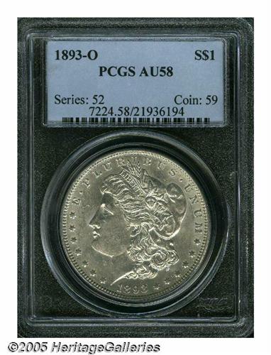 <B>1893-O<S$1> AU58 PCGS.</B></I> Slight highpoint friction on the centers denies an Uncirculated grade, but there is no shortage of cartwheel shimmer, and no unpleasant marks are detected. A low mintage date, scarcer in better grades than the similar production 1893.