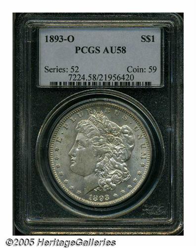 <B>1893-O<S$1> AU58 PCGS.</B></I> Typically soft in the centers, and displaying little actual wear, just a trace of rub on the highpoints, with virtually all of the satiny luster intact. A desirable near-Mint example of this scarce O-mint Morgan.