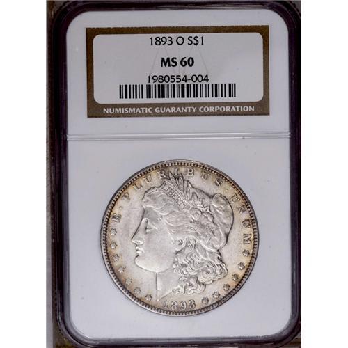 <B>1893-O<img border='0' src='http://www.heritagecoins.com/images/star.gif' width=10 height=10>$1> MS60 NGC.</B></I> This low mintage New Orleans silver dollar has golden-brown peripheral toning and no obvious marks. The centers are softly struck, as usual for the issue, and the reverse rim is abraded between 6 and 8 o'clock.