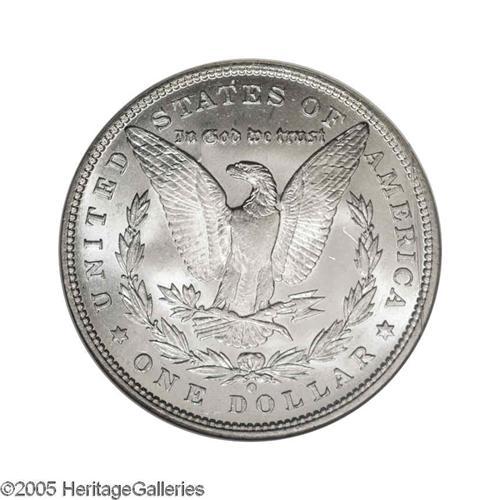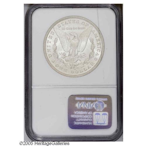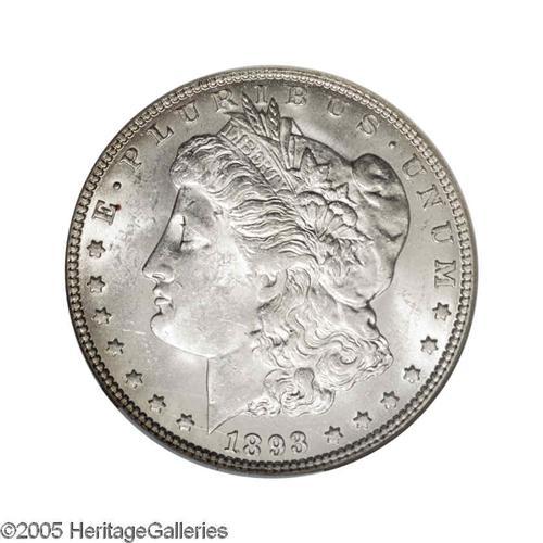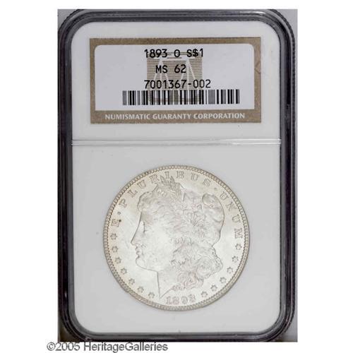 <B>1893-O<S$1> MS62 NGC.</B></I> This issue has the lowest mintage figure (300,000 pieces) for any New Orleans Mint Morgan dollar. It is scarce in all Mint State grades and rare in higher levels. The present specimen displays faint tan-gold color around the obverse rims. Most '93-Os are lightly struck; this example is slightly better defined than most, though the hair above Liberty's ear is weak. Bright surfaces exhibit some grade-defining marks on Liberty's cheek and neck and in the left (facing) obverse field.