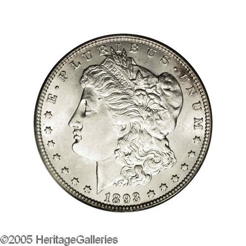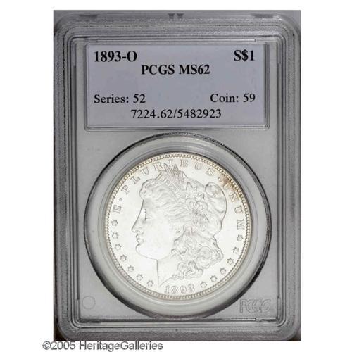 <B>1893-O<S$1> MS62 PCGS.</B></I> Brilliant save for a small toning ring on the lower reverse. Typically struck for this issue, but with semi-prooflike fields. There are minimal marks for the grade, confined mostly to the obverse and noticeable only under magnification, but unfortunately several of them are on Liberty's cheek. A long scrape, well hidden in Liberty's hair, also reveals itself under a loupe. The reverse shows evidence of die clashing above the eagle's left (facing) wing from Liberty's neck. Still an appealing example of this better-date coin, and nicer than the technical description sounds!