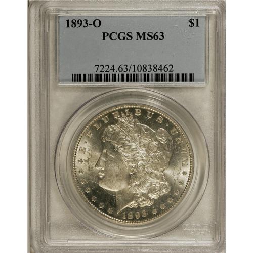 <B>1893-O S$1 MS63 PCGS.</B></I> Impressive luster illuminates this lightly toned and nicely struck O-mint dollar. Grade-limiting marks are absent, and the eye appeal is undeniable. Although it stands in the shadow of the famous 1893-S rarity, the 1893-O is also a low mintage issue, and it is scarce in Select Mint State.<BR><BR><b>Shipping:</b> Coin/Currency (<a target="_blank" href="http://www.heritageauctions.com/common/shipping.php">view shipping information</a>)