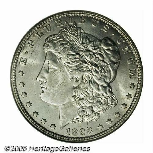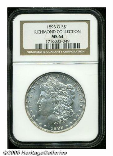 <B>1893-O<S$1> MS64 NGC.</B></I> Ex: Richmond Collection. A brilliant and lustrous near-Gem, high end for the grade despite a pair of tiny ticks near the cheekbone. Not completely brought up in the centers, the usual strike for New Orleans Dollar from the era. The 1893-O has the lowest production of any New Orleans issue, just two thirds that of the more coveted 1895-O. Although elusive in any grade, the 1893-O is a rarity above the MS63 level. NGC has only certified 31 pieces as MS64, counting 4 Prooflike pieces, with a mere four coins in Gem or better condition.