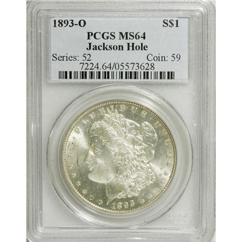 <B>1893-O S$1 MS64 PCGS.</B></I> Ex: Jackson Hole. A truly rare coin in both the conditional and absolute senses, the 1893-O boasts the smallest mintage of any Morgan dollar from the New Orleans Mint, and the fifth smallest mintage of any business strike Morgan--excluding, of course, the unknown (or unissued) 1895s. The four other Morgan issues with comparable mintages, from largest to smallest, are the 1881-CC and 1885-CC--both saved in tremendous quantities relative to their original mintages, with many thousands released from the Treasury in the early 1960s and later by the GSA--and the 1893-S and 1894, coins that formed only a tiny fraction of the Treasury holdings. The fame of the 1893-O has perhaps been overshadowed by its illustrious siblings, the coveted 1893-S, and by the last of the CC Morgans, the 1893-CC. Nonetheless, the 1893-O is many times rarer in MS64 than the 1893-CC. As Bowers' silver dollar <I>Guide Book</B></I> puts it, "Choice MS-64 coins are rare and MS-65 coins are of sufficient fame that an auction house might showcase one in a news release."<BR> The present coin is an exception to the majority of Mint State coins, in that it is refreshingly free of mentionable abrasions, save for a couple of undistracting ticks on the cheek and a nick to the right of the 3 in the date. Brilliant luster radiates from each side of the silver-white surfaces, and considerable prooflikeness is present, with mirrored fields and moderate frost on the devices. Population: 80 in 64, 9 finer (2/07).<BR><I>From The Jackson Hole Collection.</B></I><BR><BR><b>Shipping:</b> Coins & Currency (<a target="_blank" href="http://www.heritageauctions.com/common/shipping.php">view shipping information</a>)