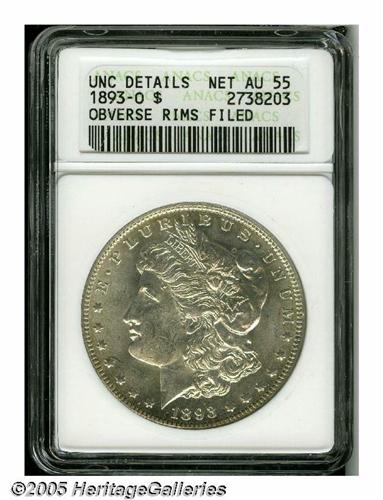 <B>1893-O<S$1>--Obverse Rims Filed--ANACS. Unc Details, Net AU55.</B></I> This lustrous and nicely struck low mintage O-mint Dollar is lightly toned and has the look of a higher grade. Upon close inspection, a patch of hairlines is near the M in UNUM, and a minor depression on the obverse rim at 3 o'clock is accompanied by nearly imperceptible file marks.<BR><I>From The Empire State Collection, Part Two.</B></I>