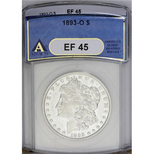 <B>1893-O<img border='0' src='http://www.heritagecoins.com/images/star.gif' width=10 height=10>$1> XF45 ANACS.</B></I> This Choice XF O-Mint dollar displays just a trace of gold-tan color, and luster is apparent in the protected areas. The design features retain nice definition, save for the hair above Liberty's ear and the eagle's breast. There are a few wispy small slide marks scattered over each side. <BR><BR><B>Important notice:</B> Heritage usually auctions material at the rate of 200-250 lots per hour. On some occasions eBay Live bid software or the Internet may not be able to keep up with the pace of the auction. We recommend placing a realistic absentee bid now as insurance to avoid disappointment. Occasionally the auctioneer may eliminate or reject an eBay Live bid, and the auctioneer may also reopen a lot after the close of the eBay live bidding (usually because we missed an audience bid), and may reject your bid even if it shows you as the winning bidder. By bidding via eBay Live, you agree that Heritage may award the lot to another bidder at its sole discretion under the circumstances described above or any other reasonable circumstances. Since eBay bids are not shown to us until we open the lot on the floor, we treat those bids just like floor bids. In most cases the floor responds before the eBay bid is presented to us, due to Internet lag time, so for consistency we have made it a policy that floor bids are always considered first over tie eBay live bids. Also please note that all Heritage lots purchased through eBay Live carry a 20% Buyer's Premium. Please make sure you read the Terms and Conditions before you bid. This lot is being auctioned in conjunction with a live floor auction by Heritage Galleries & Auctioneers. All final auction and invoice information will be supplied by Heritage Galleries & Auctioneers, and all other information should be considered preliminary. Lot:3630 <BR><BR><B>Winning Notification and Billing:</B> After the FINAL session in this auction is complete, Heritage will send e-mail and snail mail invoices. This process normally takes several days. All final auction and invoice information will be supplied by Heritage Galleries & Auctioneers, and all other information should be considered preliminary. <BR><BR>This auction will be conducted on a live auction floor and over the Internet through eBay Live. If you choose to place an absentee bid, please take a moment to <font color='#0000ff'><u><a href='http://pages.ebay.com/liveauctions/help/before/laabsentee.html'>learn how eBay Live absentee bidding works</a></u></font><font color='#000000'>