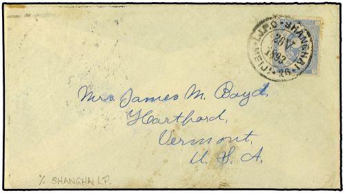 1893 Opened out envelope to USA bearing, on reverse, blue SHANGHAI LOCAL POST date stamp for May 19th. Transferred to Japanese post on 26th when 5sn applied & tied by I.J.P.O. SHANGHAI MEIJI 26 CDS. On reverse, Yokohama, San Francisco; Springfied, Mass. transits & Hartford, Vermont arrival cds.