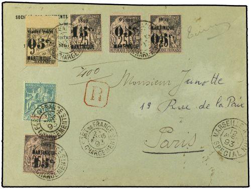1893 Registered envelope to Paris franked 5c. "Sage"; ´05c´(2) & ´15c´(2) on 25c. "Commerce" + ´05´ on 5c. postage due – all tied by Fort De France date stamp. On obverse also, Marseille A Lyon Special TPO cds.