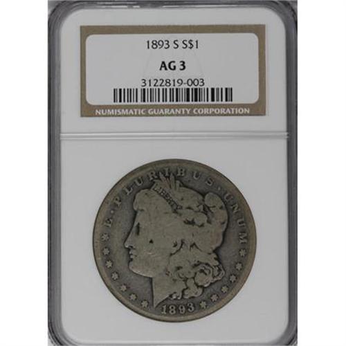 <B>1893-S $1 AG3 NGC.</B></I> Natural light gray toning darkens in the recessed areas of this key-date representative. Decent detail for the grade, though the left reverse rim merges with the legend. A few small marks, as expected for a heavily circulated coin, but essentially quite clean for the grade.<BR><BR><B>Coin Engraver:</B> George T. Morgan<BR><BR><b>Shipping:</b> Coins & Currency (<a target="_blank" href="http://www.heritageauctions.com/common/shipping.php">view shipping information</a>)