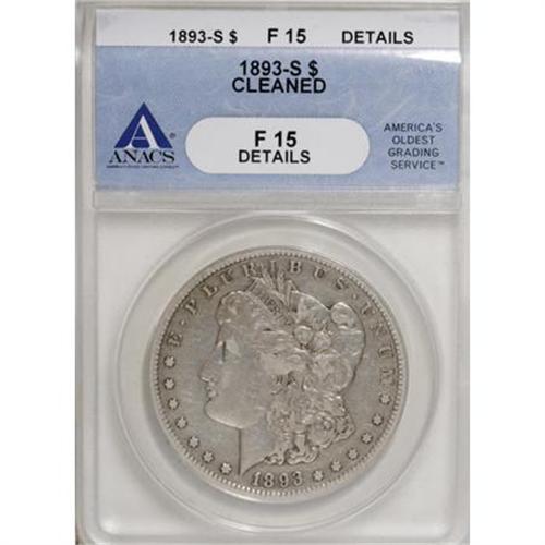 <B>1893-S $1 --Cleaned--ANACS. Fine 15 Details.</B></I> The noted cleaning has nonetheless left considerable appeal, with silver-gray surfaces that are just a tad too bright but still attractive. The rims and deep hair detail are bold, as expected for the details grade, and this piece may make a nice addition to a mid grade circulated set.<BR><BR><B>Coin Engraver:</B> George T. Morgan<BR><BR><b>Shipping:</b> Coins & Currency (<a target="_blank" href="http://www.heritageauctions.com/common/shipping.php">view shipping information</a>)