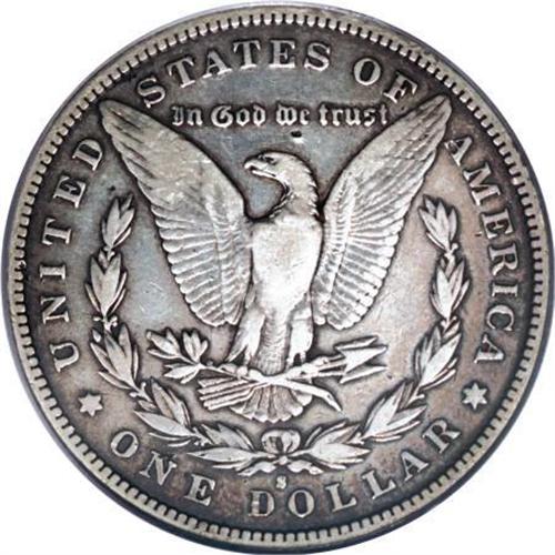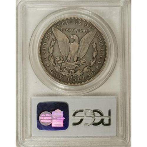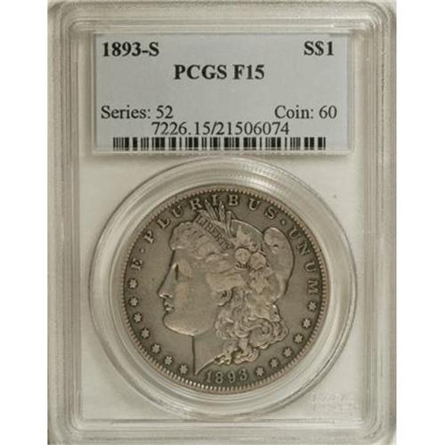 <B>1893-S $1 Fine 15 PCGS.</B></I> The battleship-gray fields transform into chestnut-gold when the piece is rotated beneath a light. Ice-blue portions of the devices correspond to the device highpoints. A tiny dig on the field above the eagle's head will identify this key date representative.<BR><BR><b>Shipping:</b> Coins & Currency (<a target="_blank" href="http://www.heritageauctions.com/common/shipping.php">view shipping information</a>)