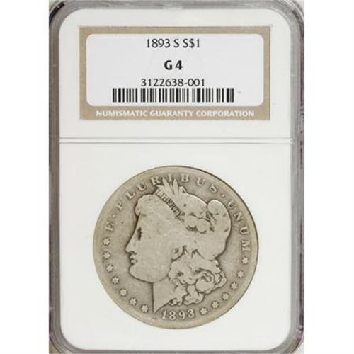 <B>1893-S $1 Good 4 NGC.</B></I> The 1893-S dollar is collectible in all grades and this well-worn piece will surely be sought out by a dollar specialist with a lower grade set of Morgans. The surfaces are uncleaned and silvery-gray overall with deep charcoal within the recesses and surrounding the devices. Little of the rim remains on the obverse, but most of the reverse rim is still present.<BR><BR><B>Coin Engraver:</B> George T. Morgan<BR><BR><b>Shipping:</b> Coins & Currency (<a target="_blank" href="http://www.heritageauctions.com/common/shipping.php">view shipping information</a>)