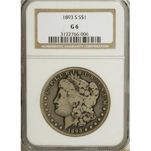 <B>1893-S $1 Good 6 NGC.</B></I> Despite considerable wear, we feel that this piece is actually undergraded, and may qualify at the VG level. Some hair detail remains on the obverse, and more than half the wing feathers are visible on the reverse. It is entirely original with steel gray patina in the fields and lighter gray on the devices.<BR><BR><B>Coin Engraver:</B> George T. Morgan<BR><BR><b>Shipping:</b> Coins & Currency (<a target="_blank" href="http://www.heritageauctions.com/common/shipping.php">view shipping information</a>)