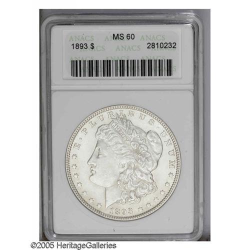 1893 S$1 MS60 ANACS. The mint bloom is soft and glowin 1893[S$1] MS60 ANACS.