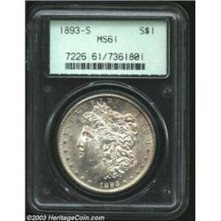 <TR><TD width="100%"><TABLE cellSpacing=1 cellPadding=3 width="100%" border=0><TBODY><TR><TD width="100%" bgColor=#79735c><FONT face=arial color=#ffffff size=3><B>Description</B> </FONT></TD></TR><TR><TD width="100%" bgColor=#ffffff><FONT face=arial size=2><B>1893-S $1 MS61 PCGS.</B></I> The brief reduced mintage years for Morgan Dollars, from 1893 to 1895, are replete with issues from the four active mints that carry varying degrees of scarcity at the Uncirculated level. However, towering above the others and difficult at all grade levels is the 1893-S, a numismatically legendary issue that is widely known to even the most casual coin collector. Its value in circulated condition can be attributed to the immense popularity of the series, but any collector serious enough to consider an example in AU or better condition must not only have the means, but also the patience. Only a few dozen Mint State pieces are known to exist, and they are among the most prized Silver Dollars of any date and any type.<BR>Affordability is a definite factor among the few remaining Uncirculated coins because the majority grade MS63 or finer. This solid Mint State representative is quite unusual in that it falls into the lower tier and yet there is no question about its Uncirculated status. The surfaces are mostly brilliant with full, frosty luster and only the expected grade-limiting contact marks on the obverse. For pedigree purposes we also note a milling mark on the lower portion of the eagle's breast. Gentlemen, start your engines. Population: 3 in 61, 21 finer (4/03). </FONT></TD></TR></TBODY></TABLE></TD></TR></TBODY></TABLE><BR><A name=PricesRealized></A><TABLE cellSpacing=0 cellPadding=0 width="100%" bgColor=#000000 border=0><TBODY><TR><TD width="100%"><TABLE cellSpacing=1 cellPadding=3 width="100%" border=0><TBODY><TR><TD width="100%" bgColor=#79735c><A name=PR><FONT face=arial color=#ffffff size=3><B>Previous Prices from Heritage Auctions</B> </FONT></A></TD></TR><TR><TD bgColor=#f6f6ed>No Prior Data Recorded </TD></TR><TR><TD bgColor=#ffffff><FONT face=arial size=1 ?>PLEASE NOTE: All prices realized reflect the final hammer price PLUS the buyer's premium in auctions that charge a buyer's premium. Each item has a notation at the top of the listing indicating whether that lot included a buyer's premium. Example: A item that sells with a final hammer price of $100 and a 20% buyer's premium will display with a price realized of $120. All information listed is intended to be as accurate as possible, but errors are possible. Please use this guide carefully and inform us of any inaccuracies. </FONT></TD></TR></TBODY></TABLE></TD></TR></TBODY></TABLE><BR><TABLE cellSpacing=0 cellPadding=0 width="100%" bgColor=#000000 border=0><TBODY><TR><TD width="100%"><TABLE cellSpacing=1 cellPadding=3 width="100%" border=0><TBODY><TR><TD width="100%" bgColor=#79735c colSpan=6><FONT face=arial color=#ffffff size=3><B>Price Guide*</B> </FONT></TD></TR><TR bgColor=#f6f6ed><TD align=middle><B>Grade</B> </TD><TD align=middle><B>Coin World<BR>(Trends)</B> </TD><TD align=middle><B>Numismedia<BR>Retail</B> </TD><TD align=middle><B>Numismedia<BR>Wholesale</B> </TD><TD align=middle><B>Coin<BR>Universe</B> </TD><TD align=middle><B>Heritage<BR>Value Index</B> </TD></TR><TR bgColor=#ffffff><TD align=middle>60</TD><TD align=right>$40,000.00</TD><TD align=right>---</TD><TD align=right>$39,500.00</TD><TD align=right>$50,000.00</TD><TD align=right>$32,700.00</TD></TR><TR style="FONT-WEIGHT: bold" bgColor=#cccfdd><TD align=middle>61</TD><TD align=right>---</TD><TD align=right>---</TD><TD align=right>$41,500.00</TD><TD align=right>---</TD><TD align=right>$37,300.00</TD></TR><TR bgColor=#ffffff><TD align=middle>62</TD><TD align=right>$50,000.00</TD><TD align=right>---</TD><TD align=right>$46,500.00</TD><TD align=right>$55,000.00</TD><TD align=right>$41,900.00</TD></TR><TR bgColor=#ffffff><TD colSpan=6><FONT size=1>*All information listed is intended to be as accurate as possible, but errors are possible. No item may be returned or refused based on this information which is provided as a service to our customers. You should contact each pricing source directly to determine the accuracy of this information. </FONT></TD></TR></TBODY></TABLE></TD></TR></TBODY></TABLE><BR><TABLE cellSpacing=0 cellPadding=0 width="100%" bgColor=#000000 border=0><TBODY><TR><TD width="100%"><TABLE cellSpacing=1 cellPadding=3 width="100%" border=0><TBODY><TR><TD width="100%" bgColor=#79735c><FONT face=arial color=#ffffff size=3><B>Population Guide</B> </FONT></TD></TR><TR bgColor=#ffffff><TD align=middle><!-- Begin Output of Population Grid--><TABLE cellSpacing=0 cellPadding=0 width="100%" border=0><TBODY><TR><TD vAlign=center><TABLE cellSpacing=0 width="100%" border=1 cellsadding="3"><TBODY><TR><TD vAlign=center><TABLE cellSpacing=0 cellPadding=3 width="100%" border=1><TBODY><TR><TD vAlign=center align=middle bgColor=#f0f1e8 colSpan=2 <CENTER><FONT face=Arial size=2><B>PCGS Pop </B></FONT><CENTER></CENTER></TD><TD vAlign=center align=middle bgColor=#f0f1e8 colSpan=2><CENTER><FONT face=Arial size=2><B>NGC Pop</B></CENTER></FONT></TD></TR><TR><TD vAlign=center><FONT face=Arial size=2>(61)</FONT> </TD><TD vAlign=center align=right><FONT face=Arial size=2>3</FONT> </TD><TD vAlign=center><FONT face=Arial size=2>(61)</FONT> </TD><TD vAlign=center align=right><FONT face=Arial size=2>1</FONT> </TD></TR><TR><TD vAlign=center><FONT face=Arial size=2>(>61)</FONT> </TD><TD vAlign=center align=right><FONT face=Arial size=2>21</FONT> </TD><TD vAlign=center><FONT face=Arial size=2>(>61)</FONT> </TD><TD vAlign=center align=right><FONT face=Arial size=2>18</FONT> </TD></TR></TBODY></TABLE></TD></TR></TBODY></TABLE></TD></TR></TBODY></TABLE><!-- End Output of Population Grid--></TD></TR></TBODY></TABLE></TD></TR></TBODY></TABLE><BR><TABLE cellSpacing=0 cellPadding=0 width="100%" bgColor=#000000 border=0><TBODY><TR> Important notice: We expect to be auctioning lots at the rate of 200