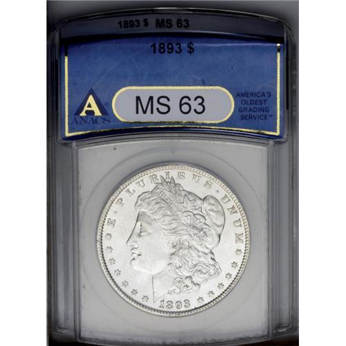1893 S$1 MS63 ANACS. Bright, silvery surfaces with a f