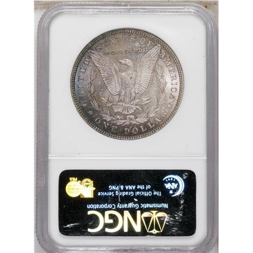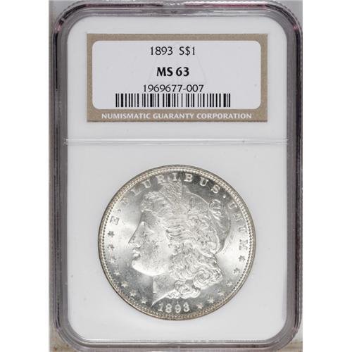 <B>1893<img border='0' src='http://www.heritagecoins.com/images/star.gif' width=10 height=10>$1> MS63 NGC.</B></I> The obverse of this lustrous coin is brilliant, while the crisply detailed reverse has plum and lavender patina. Some scuffiness on the portrait restricts the grade.