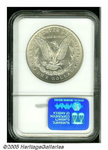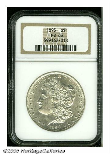 <B>1893<S$1> MS63 NGC.</B></I> This untoned Select Dollar has decent luster and unmarked surfaces. The strike is not complete in the centers, however, the remainder of the design is bold. A popular low mintage issue. The 3 in the date is lightly recut.