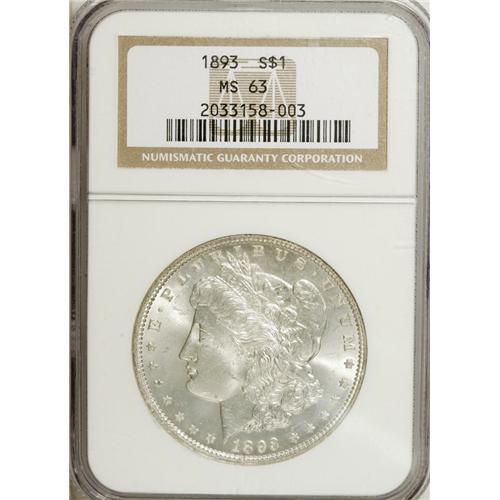 <B>1893 S$1 MS63 NGC.</B></I> Virtually colorless with only a light tan wash on the reverse. Well struck, with a handful of small grade-defining marks on the obverse. Good luster emanates from each side.<BR><BR><b>Shipping:</b> Coins & Currency (<a target="_blank" href="http://www.heritageauctions.com/common/shipping.php">view shipping information</a>)