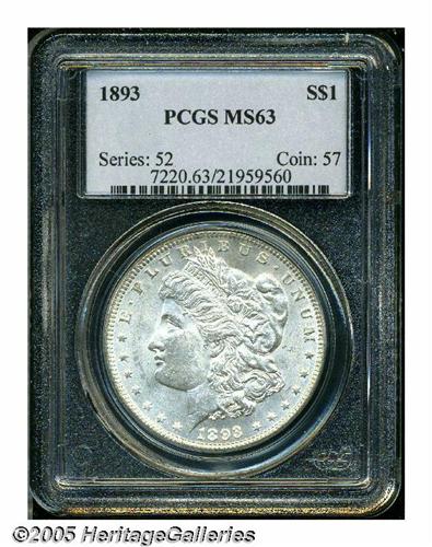 <B>1893<S$1> MS63 PCGS.</B></I> Brilliant and sharply struck with frosty silver luster and excellent surface quality. Both sides are entirely untoned.