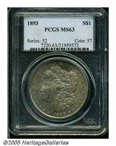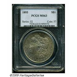<B>1893<S$1> MS63 PCGS.</B></I> Deeply toned with golden-brown and olive on the obverse, heather and light blue on the reverse. A delightful example for the grade. This is a popular issue due to the scarcity or rarity of branch mint coins.