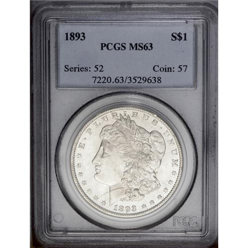 <B>1893<img border='0' src='http://www.heritagecoins.com/images/star.gif' width=10 height=10>$1> MS63 PCGS.</B></I> Lustrous surfaces display wisps of light toning on Liberty's neck and portions of the eagle. Except for softness in the hair over Liberty's ear, the design elements are well brought up. Small contact marks, especially on the cheek and left obverse field, limit the grade. A light toning streak traverses Liberty's neck. <BR><BR><B>Important notice:</B> Heritage usually auctions material at the rate of 200-250 lots per hour. On some occasions eBay Live bid software or the Internet may not be able to keep up with the pace of the auction. We recommend placing a realistic absentee bid now as insurance to avoid disappointment. Occasionally the auctioneer may eliminate or reject an eBay Live bid, and the auctioneer may also reopen a lot after the close of the eBay live bidding (usually because we missed an audience bid), and may reject your bid even if it shows you as the winning bidder. By bidding via eBay Live, you agree that Heritage may award the lot to another bidder at its sole discretion under the circumstances described above or any other reasonable circumstances. Since eBay bids are not shown to us until we open the lot on the floor, we treat those bids just like floor bids. In most cases the floor responds before the eBay bid is presented to us, due to Internet lag time, so for consistency we have made it a policy that floor bids are always considered first over tie eBay live bids. Also please note that all Heritage lots purchased through eBay Live carry a 20% Buyer's Premium. Please make sure you read the Terms and Conditions before you bid. This lot is being auctioned in conjunction with a live floor auction by Heritage Galleries & Auctioneers. All final auction and invoice information will be supplied by Heritage Galleries & Auctioneers, and all other information should be considered preliminary. Lot:3614 <BR><BR><B>Winning Notification and Billing:</B> After the FINAL session in this auction is complete, Heritage will send e-mail and snail mail invoices. This process normally takes several days. All final auction and invoice information will be supplied by Heritage Galleries & Auctioneers, and all other information should be considered preliminary. <BR><BR>This auction will be conducted on a live auction floor and over the Internet through eBay Live. If you choose to place an absentee bid, please take a moment to <font color='#0000ff'><u><a href='http://pages.ebay.com/liveauctions/help/before/laabsentee.html'>learn how eBay Live absentee bidding works</a></u></font><font color='#000000'>