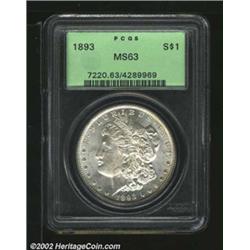 1893 S$1 MS63 PCGS. The 3 in the date is clearly repunched directly north. A lustrous representative that has an above average strike and surprisingly unabraded fields. Important notice: We expect to be auctioning lots at the rate of 200-250 per hour. Sometimes eBay Premier live bid software cannot keep up with that pace, so we strongly recommend that you place a realistic proxy bid now as insurance to avoid disappointment. Also please note that all Heritage/CAA lots purchased through eBay Premier carry a 20% Buyer's Premium. Please make sure you read the Terms and Conditions.