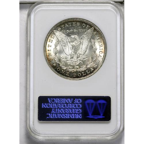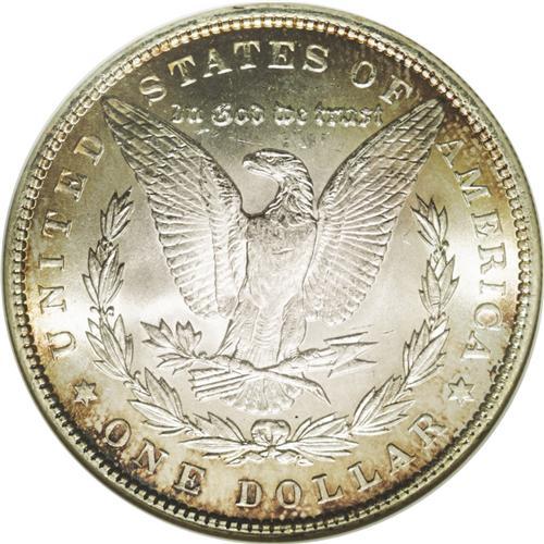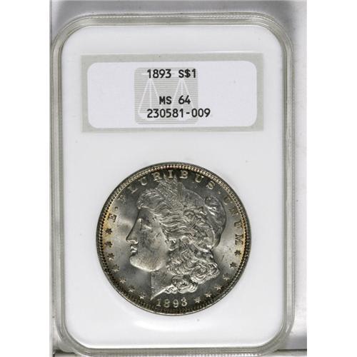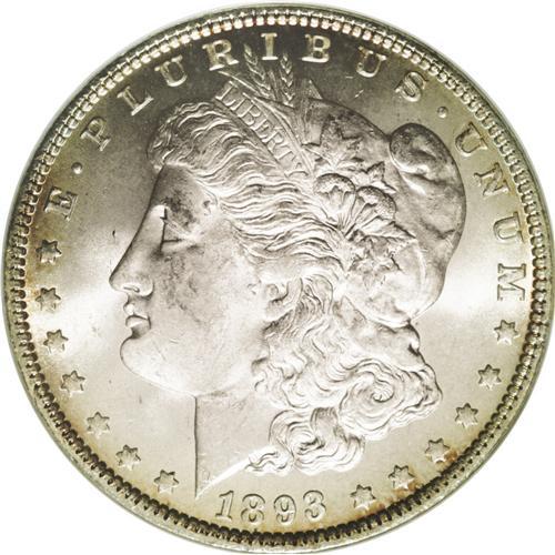 <B>1893<img border='0' src='http://www.heritagecoins.com/images/star.gif' width=10 height=10>$1> MS64 NGC.</B></I> Light golden-brown and rose-red visit this highly lustrous and refreshingly clean near-Gem. The centers lack pinpoint definition, but the strike is generally crisp. As usual for the 1893, the 3 in the date is repunched north. This low mintage silver dollar is certified in an older generation holder.