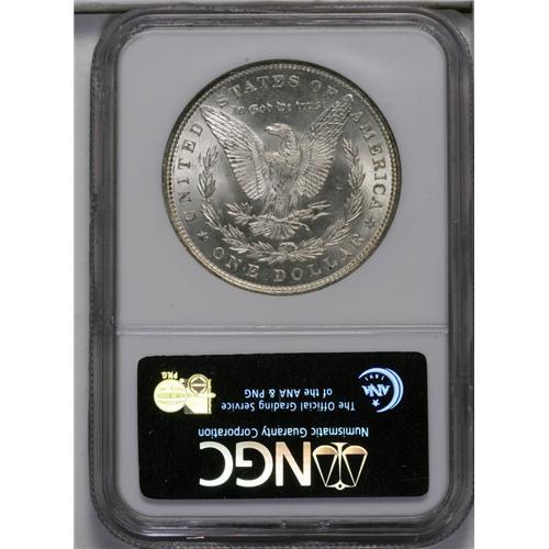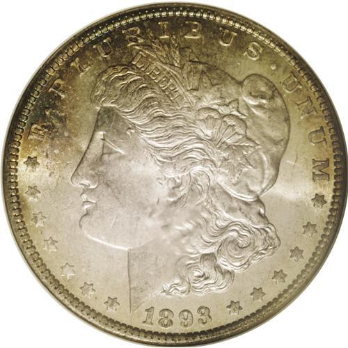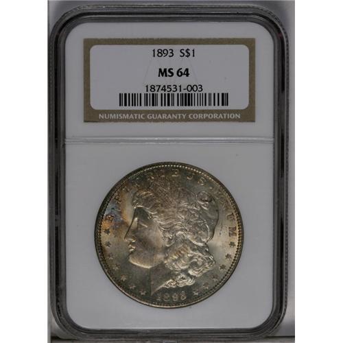 <B>1893<img border='0' src='http://www.heritagecoins.com/images/star.gif' width=10 height=10>$1> MS64 NGC.</B></I> Only a few small abrasions are noted on the obverse, while the reverse is virtually devoid of contact marks. Just a bit of striking softness in the centers, as usual. Essentially brilliant on the reverse, with a coating of light golden patina on the obverse and cobalt-blue, burnt-orange, and crimson coloration near the upper left obverse border that bleeds over slightly onto Liberty's portrait. Often collected for date-only purposes, Choice '93-P dollars are perpetually popular.