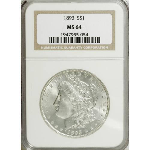 <B>1893 S$1 MS64 NGC.</B></I> This low mintage Morgan dollar has vibrant luster and only a whisper of gold toning. A suitably struck piece with the initial look of a Gem, although small mint-made strike-throughs affect the tip of the nose and the cheek near the mouth.<BR><BR><b>Shipping:</b> Coins & Currency (<a target="_blank" href="http://www.heritageauctions.com/common/shipping.php">view shipping information</a>)