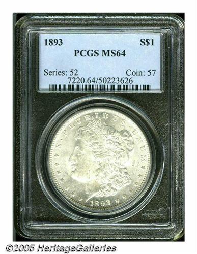 <B>1893<S$1> MS64 PCGS.</B></I> A brilliant and satiny example of this scarcer date from the mid-1890s. Just a bit soft over the ear of Liberty, as always.