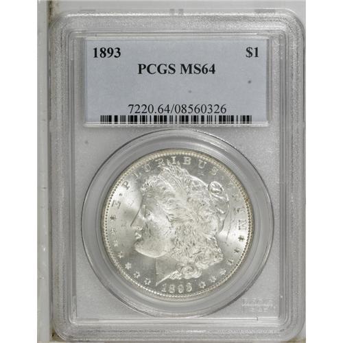 <B>1893 S$1 MS64 PCGS.</B></I> David Bowers (1993) writes that most Uncirculated 1893 dollars known today are in the MS60 to MS62 grade range, and that near-Gem and better pieces are quite elusive. This MS64 specimen displays traces of tan-gold color on the reverse. The design features are well impressed, and a few obverse marks define the grade. Light roller marks are noted in the hair over Liberty's ear.<BR><BR><b>Shipping:</b> Coins & Currency (<a target="_blank" href="http://www.heritageauctions.com/common/shipping.php">view shipping information</a>)