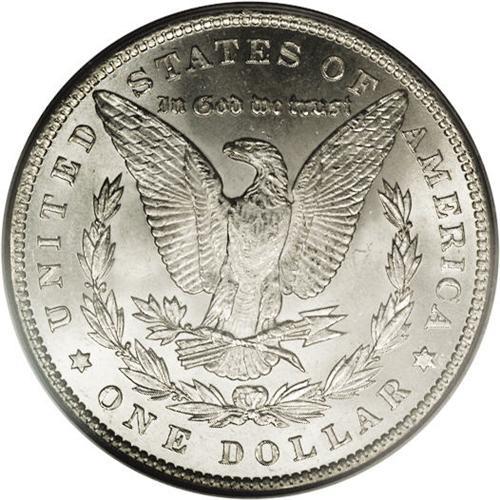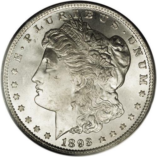<B>1893<img border='0' src='http://www.heritagecoins.com/images/star.gif' width=10 height=10>$1> MS64 PCGS.</B></I> Full frosty luster emanates from both sides of this untoned example. The obverse shows a few too many light bagmarks to make the Gem level, whereas the reverse meets and sustains the requirements for the assigned MS64 grade. Scarce as a Mint State date.