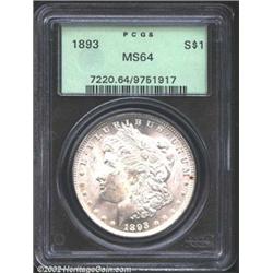 1893 S$1 MS64 PCGS. Generally brilliant, but the cheek has a wisp of gold patina. The top of the 3 in the date is lightly repunched. A lustrous near-Gem with an above average strike and pleasing surfaces. Important notice: We expect to be auctioning lots at the rate of 200-250 per hour. Sometimes eBay Premier live bid software cannot keep up with that pace, so we strongly recommend that you place a realistic proxy bid now as insurance to avoid disappointment. Also please note that all Heritage/CAA lots purchased through eBay Premier carry a 20% Buyer's Premium. Please make sure you read the Terms and Conditions.