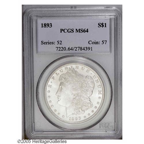 <B>1893<S$1> MS64 PCGS.</B></I> Lustrous and nicely struck with nearly brilliant surfaces. Clean fields accompany moderately marked devices. A popular low mintage Philadelphia issue.