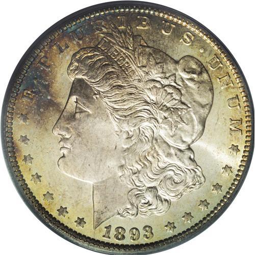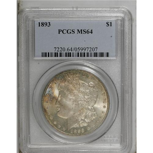 <B>1893 S$1 MS64 PCGS.</B></I> The obverse is lightly toned in gentle gold color, with peripheral areas of magenta and cobalt blue visible at 10 and 11 o'clock. In contrast, the reverse is virtually white. Silky luster covers the surfaces, which show no individually distracting abrasions.<BR><BR><b>Shipping:</b> Coin/Currency (<a target="_blank" href="http://www.heritageauctions.com/common/shipping.php">view shipping information</a>)