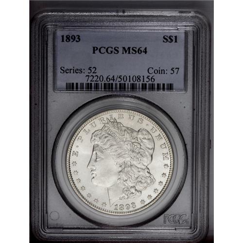 <B>1893<img border='0' src='http://www.heritagecoins.com/images/star.gif' width=10 height=10>$1 MS64 PCGS.</B></I> This is a fully brilliant and lustrous example with frosty surfaces. This example is much finer than the usually seen Mint State example, and has very few bagmarks. Typically, surviving 1893 dollars from the Treasury hoard or the Redfield hoard are heavily bagmarked and barely qualify as MS60.