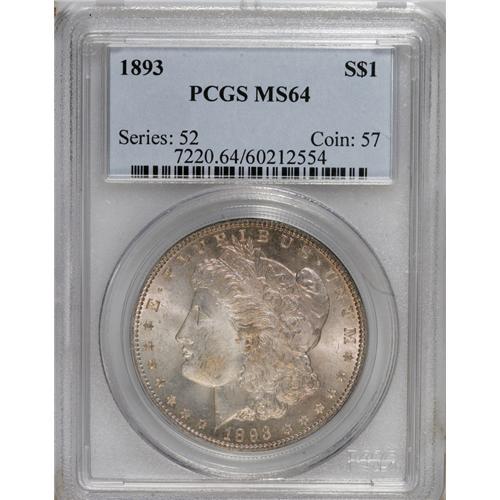 <B>1893 S$1 MS64 PCGS.</B></I> This lustrous low-mintage Morgan dollar has charming salmon-pink and gunmetal-gray toning. Nicely struck, and void of relevant contact. As is the case with most 1893 dollars, the peak of the 3 in the date is recut.<BR><BR><b>Shipping:</b> Coins & Currency (<a target="_blank" href="http://www.heritageauctions.com/common/shipping.php">view shipping information</a>)