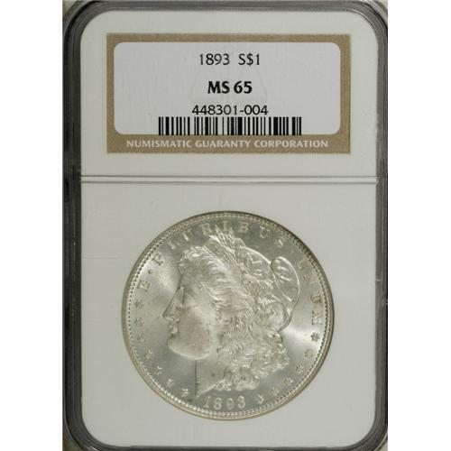 <B>1893 S$1 MS65 NGC.</B></I> This lustrous and low mintage Gem has a wisp of tan and ice-blue patina, but most observers would consider it brilliant. The strike is slightly incomplete in the centers, but the remaining portions of the designs are well defined. Census: 65 in 65, 3 finer (1/07).<BR><BR><b>Shipping:</b> Coins & Currency (<a target="_blank" href="http://www.heritageauctions.com/common/shipping.php">view shipping information</a>)