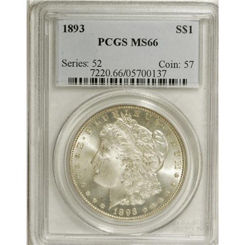 <B>1893 S$1 MS66 PCGS.</B></I> Only the slightest pale gold toning can be seen on each side of this beauty. The strike on this example is above average, and the eye appeal is exceptional. The connoisseur will truly appreciate this piece, especially when the typical appearance of the date is considered. Proof examples are usually lightly struck, thus such coins provide a poor alternative for this date.<BR> Due to the rarity of the famous 1893-S Morgan dollar, all four issues of the year are considered important. In addition to the '93-S, the 1893-O dollar is extremely rare in Mint State grades, leaving only the 1893-P and CC issues for one-per-year collectors, and the Carson City Mint coins have their own loyal following. Compared to these other issues, the 1893 Morgan dollar seems to be somewhat underrated. But make no mistake, this issue is a rarity in its own right, especially in Gem or finer grade.<BR> Only 378,000 examples were coined in Philadelphia during the year, with a total production of fewer than 1.5 million coins at all mints. Five different varieties are recorded in Van Allen-Mallis, all of a minor nature. Regarding distribution of this date, Dave Bowers remarked: "Not much is known about early releases of 1893 Morgan dollars, except that the low mintage attracted numismatic interest. Worn coins were plentiful in bank holdings and in circulation. Some bags were liberated in the early 1950s, by which time the date was numismatically scarce. A few bags came out in 1962-1964, but the issue remained scarce." Population: 3 in 66, 1 finer (2/07).<BR><I>From The Jackson Hole Collection.</B></I><BR><BR><b>Shipping:</b> Coins & Currency (<a target="_blank" href="http://www.heritageauctions.com/common/shipping.php">view shipping information</a>)