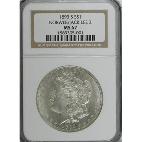 <B>1893-S $1 MS67 NGC.</B></I> Ex: Norweb-Jack Lee II. The historic background that explains the low mintage of the 1893-S dollar was best explained in our 2007 Dallas Auction: <BR><BR> "The year 1893 brought several events that ultimately influenced this and related issues. The silver purchase clause of the Act of July 14, 1890 was repealed on November 1, 1893, resulting in a drastically reduced need for silver to be converted into coinage. For the next few years, mintages of silver dollars were substantially smaller than in previous years."<BR><BR> An expanded discussion of the Panic of 1893 provides further background for the scarcity of silver dollars from this year and was provided in the December 31, 2007 issue of <I>Coin World</B></I>:<BR><BR> "The panic was marked by toppling businesses and failing banks, and the infusion of European investors in American concerns did little to stem the downturn as the depression stretched overseas as well. ... Despite the nationwide loss of more than 4 million jobs, President Grover Cleveland had taken a hands-off approach, believing the struggling business climate was cyclical.<BR> "Cleveland was, however, troubled by the nation's dwindling gold reserves, which had been steadily declining during the waning years of the Benjamin Harrison presidency.<BR> "Cleveland blamed the problems on Congress' lavish spending and the impact of the Sherman Silver Purchase Act of 1890.<BR> "The Sherman Act provided the Treasury with the authority:<BR> --To purchase 4.5 million ounces (or 281,250 pounds) of silver each month at market rates.<BR> --To issue notes redeemable in either gold or silver; these are the Treasury notes, also called coin notes. ...<BR> "The planned government purchases amounted to almost the total monthly output from the mines ... <BR> "The increased supply of silver drove down the price of the metal.<BR> "As the price of silver continued to decline, holders of the government notes understandably redeemed them for gold (whose price wasn't falling) rather than silver.<BR> "The result of the growing disparity between the two metals was the depletion of the U.S. gold reserves."<BR><BR> It was against this monetary backdrop that silver dollars were produced in 1893. The result was predictably low at not only the San Francisco mint, but also the other three mints at Philadelphia, New Orleans, and Carson City. Only 100,000 dollars were struck in the San Francisco facility. All 100,000 pieces were struck from a single die pairing--the most widely known die characteristic being a diagonal die scratch in the top of the T in LIBERTY. <BR> What happened after these coins were produced remains a mystery. Most likely it is a case of heavy attrition. Most of the production run probably met the same fate as many other silver dollars from this era: They were melted under the terms of the 1918 Pittman Act. Of course, as with many other numismatic rarities, there are always stories about rolls and bags. But these have turned out to be nothing more than numismatic "old-wives' tales." <BR> In the 1988 Norweb catalog it was speculated that this coin might have been one of the pieces reserved for examination by the Assay Commission. No concrete evidence is given for this belief, but it would explain the superlative condition of this coin. <BR> The high grade (Uncirculated) examples of the 1893-S we have seen over the years all have the same luster characteristics. One expects thick, frosted mint luster from an S-mint dollar, but the finish on the 1893-S is invariably satiny. The only other San Francisco issue that comes readily to mind with this sort of finish is the 1912-S nickel. This piece has brilliant surfaces throughout. The striking details are slightly soft over the ear of Liberty, but all the eagle's breast feathers are present. Because of the extraordinary preservation of this coin, a strong magnifier is necessary to verify that this is indeed the Norweb coin. The following are tiny identifiers for this piece: a microscopic spot in the obverse field between stars 2 and 3; between the right stand of the M in UNUM and the lower portion of the cap of Liberty is a short, shallow, vertical mark in the field; an irregular-shaped planchet flake is located adjacent to the upper-back part of the eagle's head on the reverse; and a vertical milling mark (three mills long) is in the reverse field between the left portion of the wreath and the eagle's left (facing) wing. <BR> This is the only MS67 certified by NGC. The PCGS Population Report shows two pieces graded MS67. One of those pieces is this coin, as the original PCGS insert (Norweb/Jack Lee 2) accompanies the piece. <BR><I>Ex: Norweb III (Bowers and Merena, 11/1988), lot 3887, where it brought $357,500, a record for any Morgan dollar at that time; David Carter and George Bodway; PCGS Tour Coin, 1990 and 1991; Jack Lee. </B></I><BR> <BR><BR> <BR><BR><B>Coin Engraver:</B> George T. Morgan<BR><BR><b>Shipping:</b> Coins & Currency (<a target="_blank" href="http://www.heritageauctions.com/common/shipping.php">view shipping information</a>)