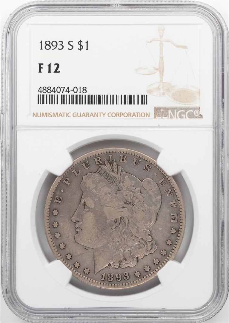 One 1893-S $1 Morgan Silver Dollar Coin NGC F12. NGC Certified.