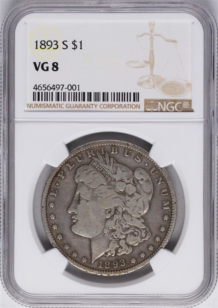 One 1893-S $1 Morgan Silver Dollar Coin NGC VG8. NGC Certified.