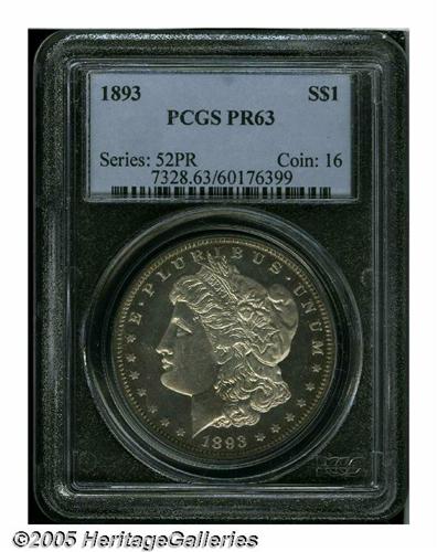 <B>1893<S$1> PR63 PCGS.</B></I> One of 792 proofs minted this year. This example displays light gold-tan patina along the obverse periphery, and deeper golden-brown, lilac, and cobalt-blue coloration throughout the reverse. The hair above Liberty's ear is weak, as are the breast feathers on the eagle. Some light wispy hairlines are noted over each side.<BR><I>From The Dr. John L. Pellegrini Collection.</B></I>