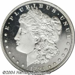 <B>1893<S$1> PR67 Deep Cameo PCGS.</B></I> Untoned with a glittering snow-white appearance over each side. This proof Morgan has exceptional cameo contrast; the fields are brilliant, deeply mirrored, and pitch black, the devices are heavily frosted. The cheek has a whisper of a luster graze, and there is a miniscule planchet flake (as struck) below the S in PLURIBUS, but the surfaces are otherwise flawless. The strike is razor sharp on the reverse, and well above average on the obverse. This is currently tied with just two other examples at PCGS as the finest certified Deep Cameo example (7/04). <BR><BR><B>Important notice:</B> Heritage usually auctions material at the rate of 200-250 lots per hour. On some occasions eBay Live bid software or the Internet may not be able to keep up with the pace of the auction. We recommend placing a realistic absentee bid now as insurance to avoid disappointment. Occasionally the auctioneer may eliminate or reject an eBay Live bid, and the auctioneer may also reopen a lot after the close of the eBay live bidding (usually because we missed an audience bid), and may reject your bid even if it shows you as the winning bidder. By bidding via eBay Live, you agree that Heritage may award the lot to another bidder at its sole discretion under the circumstances described above or any other reasonable circumstances. Since eBay bids are not shown to us until we open the lot on the floor, we treat those bids just like floor bids. In most cases the floor responds before the eBay bid is presented to us, due to Internet lag time, so for consistency we have made it a policy that floor bids are always considered first over tie eBay live bids. Also please note that all Heritage lots purchased through eBay Live carry a 20% Buyer's Premium. Please make sure you read the Terms and Conditions before you bid. </span></font></tr></table></td></tr></table>