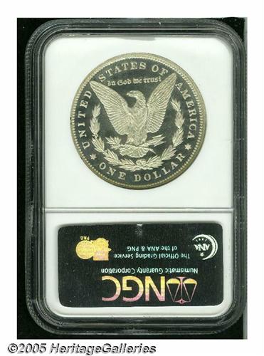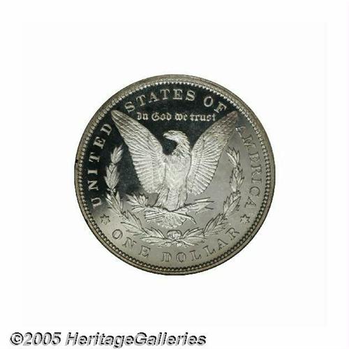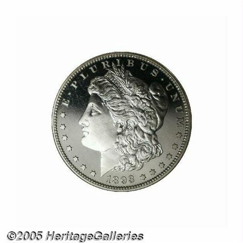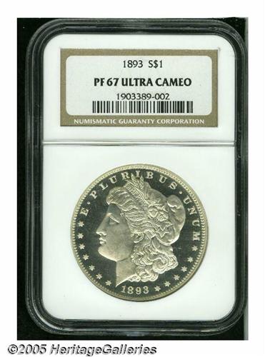 <B>1893<S$1> PR67 Ultra Cameo NGC.</B></I> The proof mintage for this year is a scant 792 pieces, a low percentage of which survive today in such a spectacular state of preservation. This is an impressively cameoed specimen with unfathomably deep mirrors contrasted against deeply frosted devices. Both sides present a fully brilliant, snow-white appearance without the barest hint of color.<BR> Interestingly enough, there is no noticeable striking deficiency on the hair strands over the ear of Liberty or the eagle's breast feathers, which is fairly common on proofs from the early 1890s. This was due to the designated striking pressure being set too low and / or the coins being coined with fewer than normal strikes of the press. We are unsure why this occurred as not all proofs lacked this detail, including this one! As a future identifier, a single tiny abrasion is noted at the center of the eagle's breast on the reverse. Nonetheless, this is a wonderful, carefully preserved specimen worthy of a Superb collection. This is the single finest Ultra Cameo specimen known to NGC (6/05).