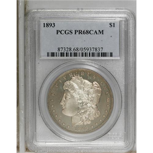 <B>1893 S$1 PR68 Cameo PCGS.</B></I> For collectors who have followed proof Morgans over the years, the 1893 is an interesting case study. This issue is best-typified by the following quote from Dave Bowers 1993 <I>Silver Dollar Encyclopedia:</B></I><BR><BR> "The situation of flatly struck Proof coins begun in 1888--coins with lightness of strike above Miss Liberty's ear on the obverse and on the eagle's breast feather on the reverse--was continued. In 1892 and 1893 dollars the flatness is particularly noticeable; more so than in the earlier years. Often the obverse center is quite flat, and on the reverse the eagle's feathers are missing. The majority of Proof 1893 dollars are flatly struck. The VAM text calls the 1893 dollars 'the most poorly struck Morgan proofs.' "<BR><BR> That being said, there are also a small number of high quality, cameo 1893 dollars known. We offered a PR68 <img border='0' src='http://www.heritagecoins.com/images/star.gif' width=10 height=10> in our 2005 ANA Sale. The most notable 1893 is a coin that Roger Bryan owned and exhibited in the early 1980s, a heavily contrasted snow-white piece. This coin is among those elite few well-produced, cameo examples of this challenging date. There is just a bit of striking softness over the ear of Liberty on the obverse, but curiously the eagle's feathers appear to be fully defined. A significant amount of mint frost is present on the devices, which when coupled with the unfathomable depth of reflectivity in the fields yields a strong two-toned contrast on each side. There is just the slightest deepening of the peripheral golden color on both obverse and reverse. Little needs (or can) be said about the technical preservation of the surfaces--it is nearly perfect--and strong magnification only confirms the lofty grade assigned by PCGS. This is the only PR68 Cameo certified by PCGS, and NGC has graded one (the PR68 <img border='0' src='http://www.heritagecoins.com/images/star.gif' width=10 height=10> mentioned above). One of the finest examples known of this challenging proof date.<BR><BR><b>Shipping:</b> Coins & Currency (<a target="_blank" href="http://www.heritageauctions.com/common/shipping.php">view shipping information</a>)