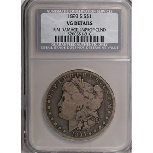 <B>1893-S $1 --Rim Damage, Improperly Cleaned--NCS. VG Details.</B></I> Some light rim bruises and fine obverse hairlines are noted. Medium gray toning covers the fields, while lighter shades of gray are on the devices. Generally well defined on the design features, and devoid of significant contact marks. The above-mentioned impairments are not all that bad.<BR><BR><B>Coin Engraver:</B> George T. Morgan<BR><BR><b>Shipping:</b> Coins & Currency (<a target="_blank" href="http://www.heritageauctions.com/common/shipping.php">view shipping information</a>)