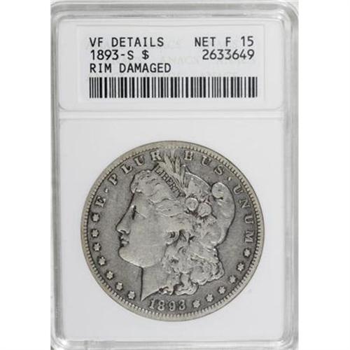 <B>1893-S $1 --Rim Damaged--ANACS. VF Details. Net Fine 15.</B></I> The reverse rim is bruised at 6 o'clock, and a minor pinscratch is noted near the M in UNUM. Light gold and sky-blue toning helps recover the eye appeal. The eagle's wings and tailfeathers retain much plumage detail. A collectible example of this coveted series key.<BR><BR><b>Shipping:</b> Coins & Currency (<a target="_blank" href="http://www.heritageauctions.com/common/shipping.php">view shipping information</a>)